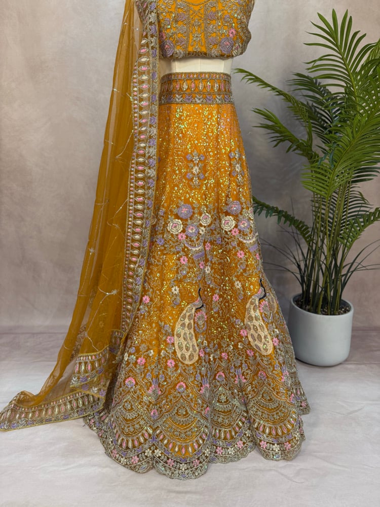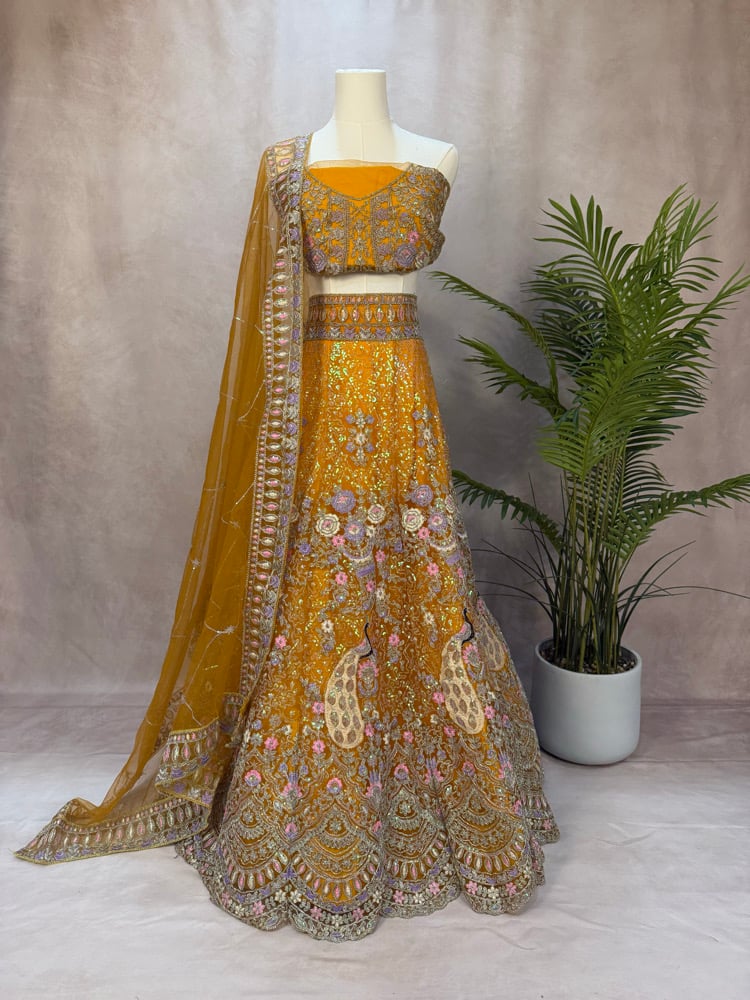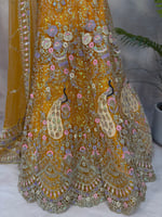 Elegant mustard yellow semi-stitched lehenga with soft lavender and pink accents.